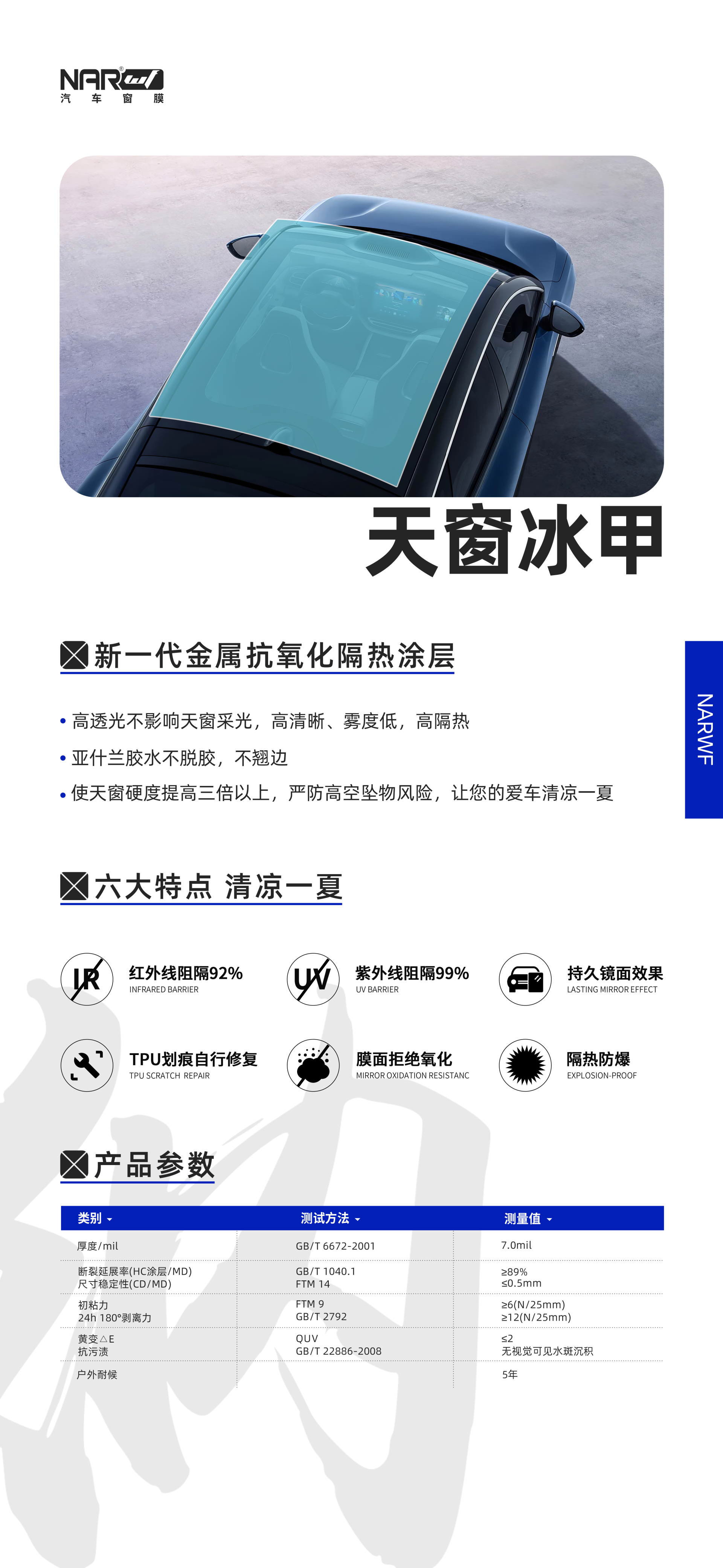 新一代金属抗氧化隔热涂层,高透光不影响天窗采光,高清晰雾度低,高隔热,亚什兰胶水不脱胶,不翘边。使得天窗硬度提高三倍以上,严防高空坠物风险,让您的爱车清凉一夏!